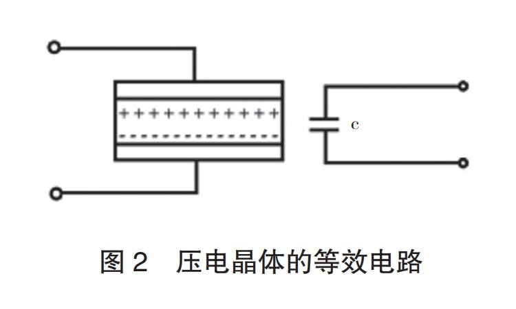 压电传感器大多是利用正压电效应制成的。应用具有压电效应的材料制作的检测元件,称为压电元件。当压电晶片受力时,在晶片的两个表面上分别聚集等量的正、负电荷,晶片的两表面相当于一个电容的两个极板,两极板间的物质等效于一种介质,于是压电晶片相当于一只平行板介质电容器,如图2所示。