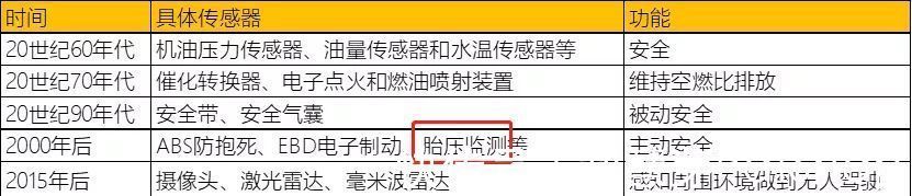 目前,相对较新的领域来自于无人驾驶(如摄像头、激光雷达、毫米波雷达等),其次为主动安全领域(ABS防抱死、EBD电子制动、TPMS胎压监测等),而我国能力较强的领域为TPMS胎压监测系统。