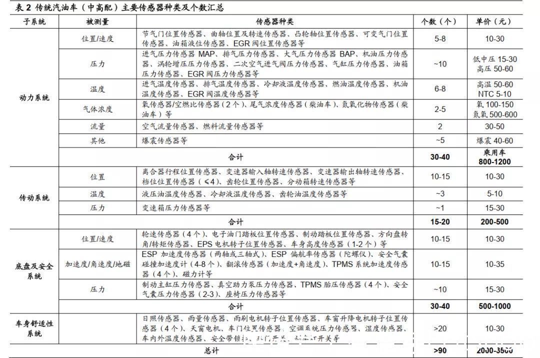 图:传统汽油车传感器数量和价格汇总