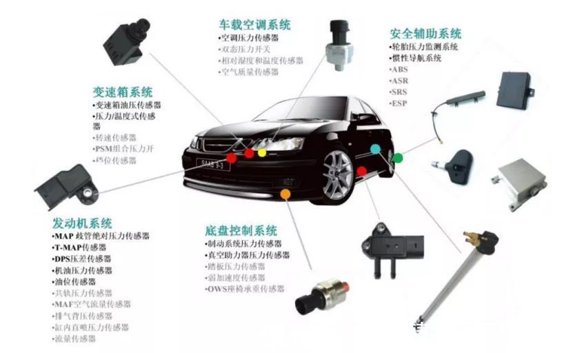 目前,传统汽车传感器应用于动力传动系统、车辆控制系统、车身控制系统、通信系统等各个方面。
